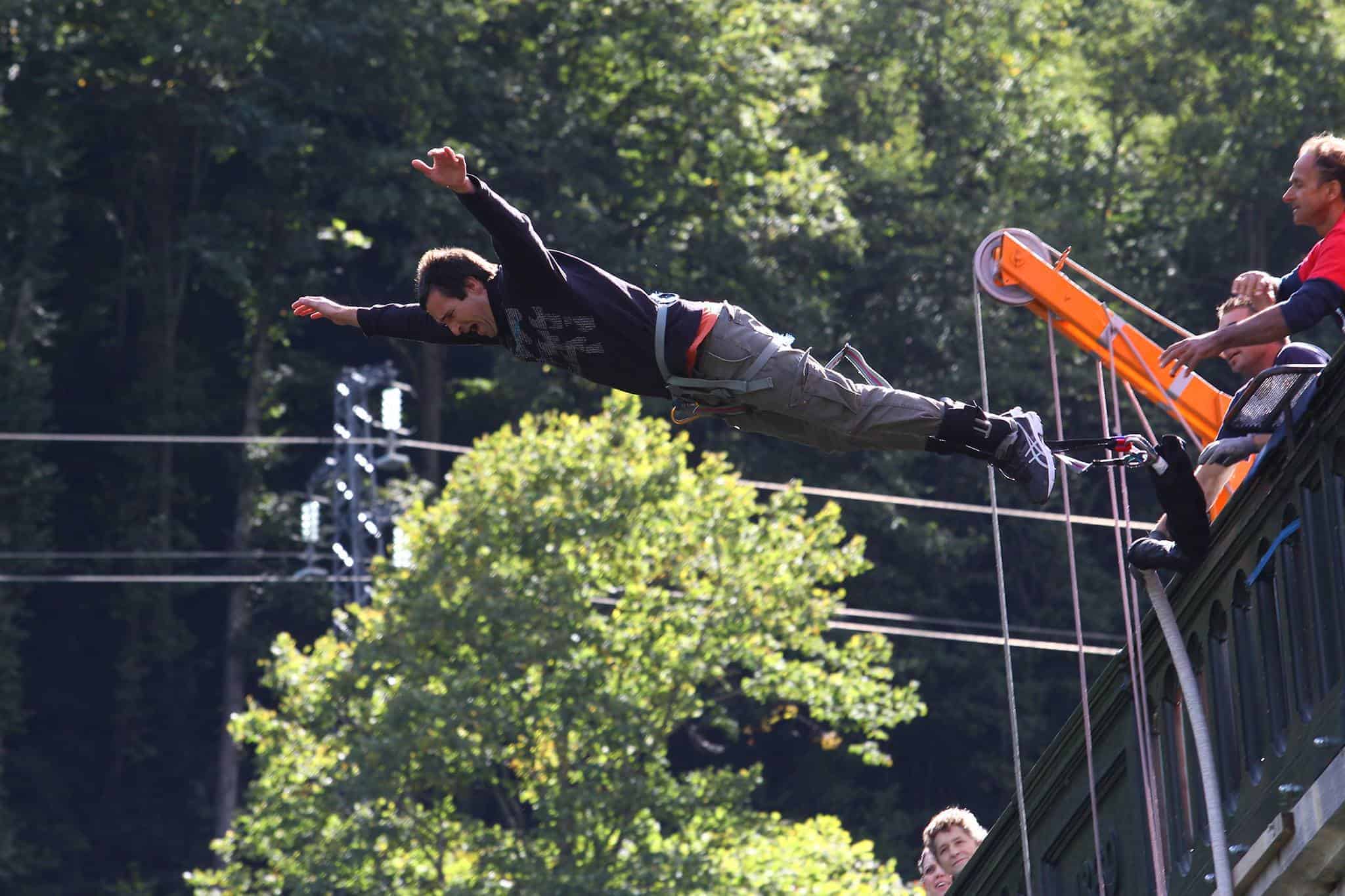 – Nous l’équiperons d’un baudrier et de jambières reliés à l’élastique, puis notre instructeur lui expliquera les consignes de sécurité depuis la plateforme. C’est le grand moment, il peut désormais s’élancer et sauter du Pont Napoléon !